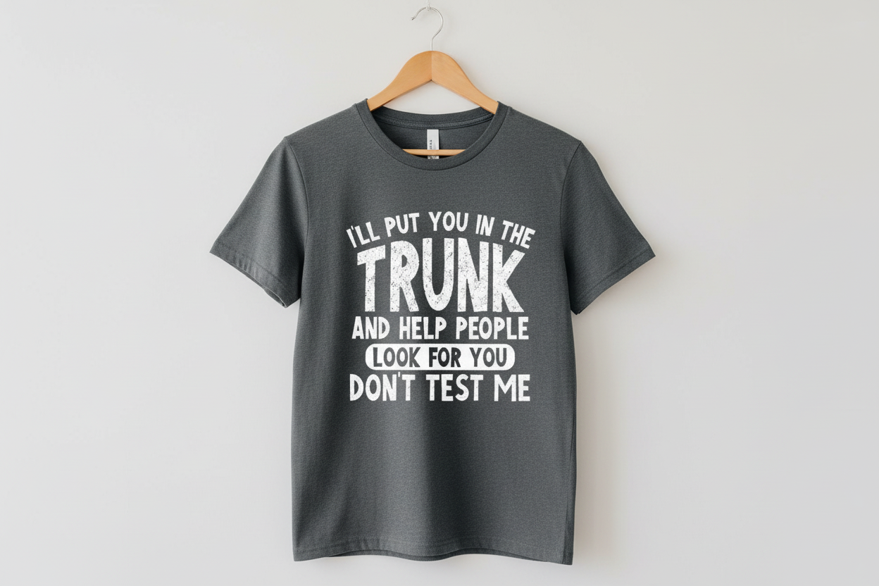 Got something to say? Say it with style in our I'll Put You in the Trunk t-shirt. This bold, sassy graphic tee features a playful design that's equal parts cheeky and confident—perfect for those who don't take themselves too seriously.