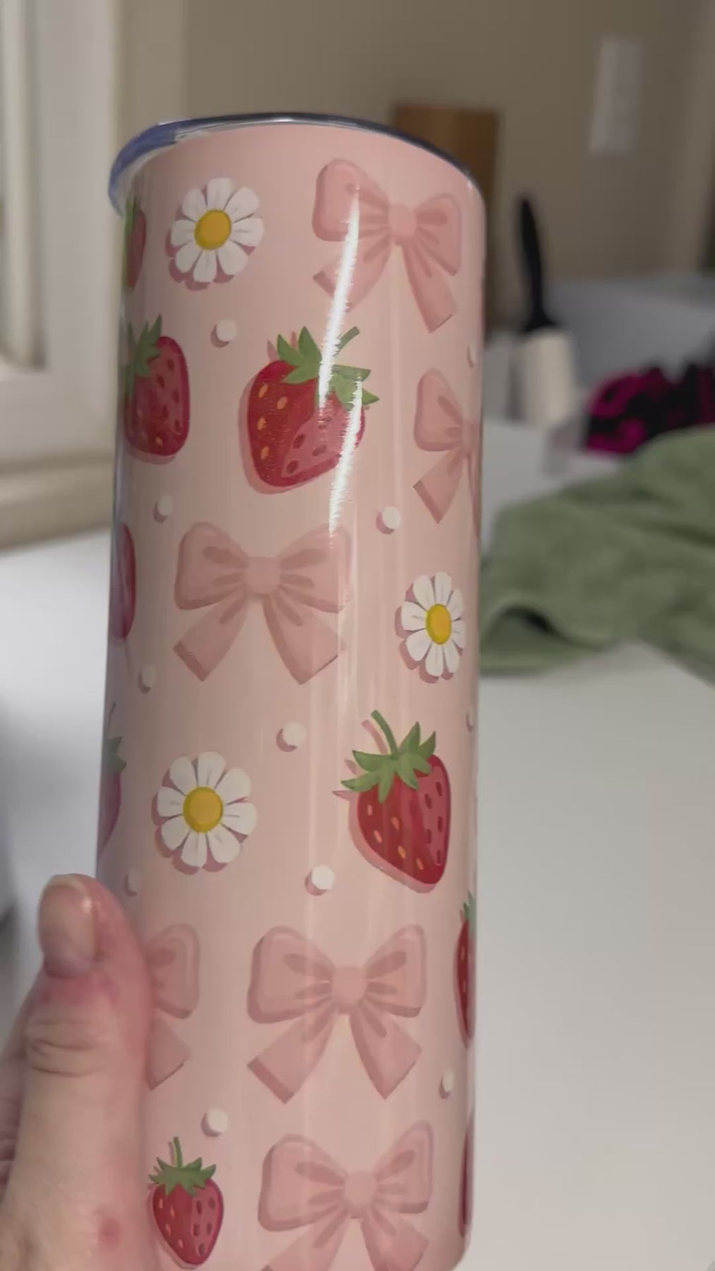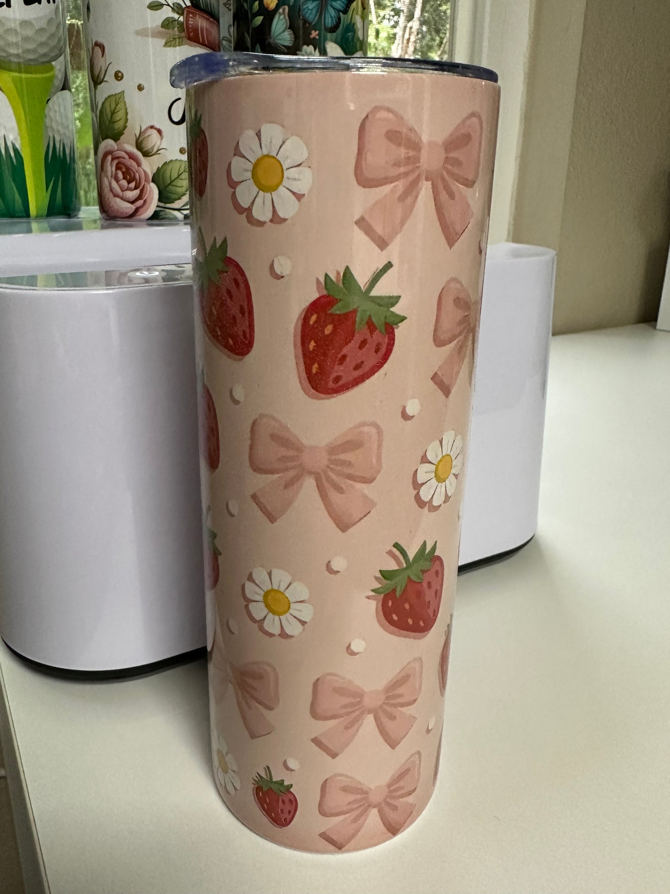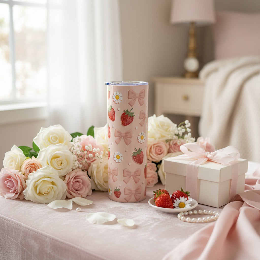 Elevate your daily hydration with this 20oz stainless steel tumbler, featuring a charming pink strawberry and bow design. Double-wall insulation keeps beverages at your preferred temperature for hours, whether you're sipping hot coffee or cold refreshments. The durable stainless steel construction, hand-wash care ensures the vibrant artwork stays pristine. Perfect for gifting or personal use, this tumbler combines functionality with premium aesthetic appeal—ideal for anyone who values both style and performance in their everyday essentials.
