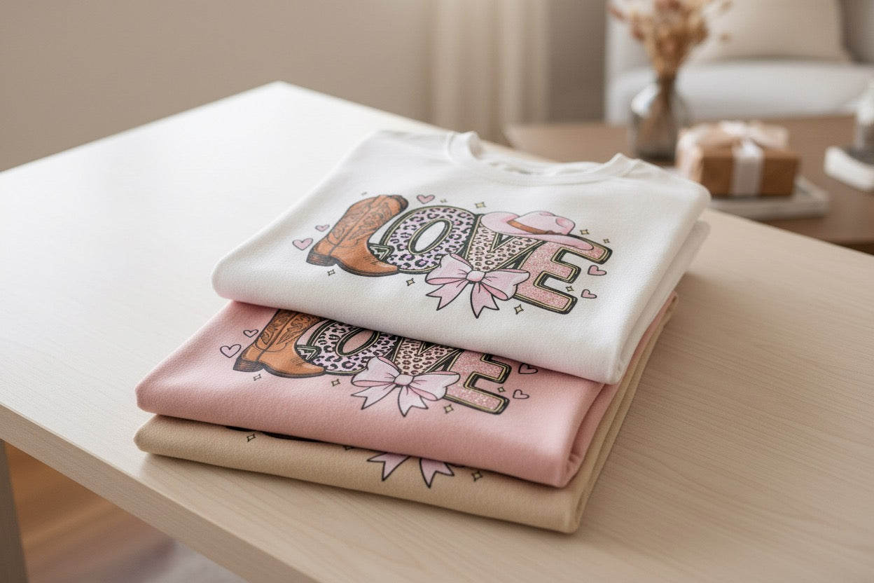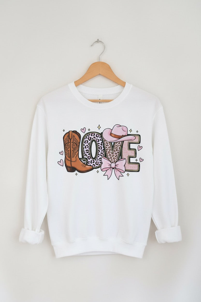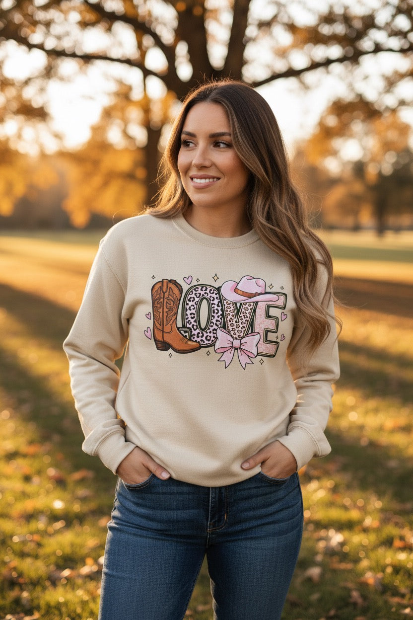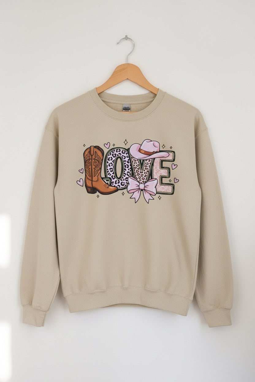 Saddle up for a little Western charm with our Cowboy Love sweatshirt. This cozy crewneck blends soft cotton with durable poly for all-day comfort, whether you're hitting the range or just channeling your inner cowpoke. Perfect for anyone who loves a good laugh and a warm, relaxed fit. Wrangle compliments wherever you roam.